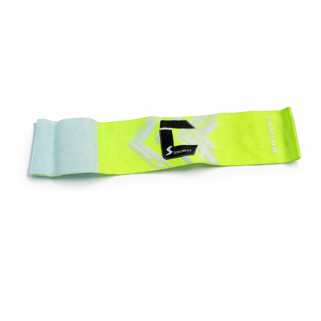 A neon green elastic sports band with reflective markings lies flat on a light tiled floor.