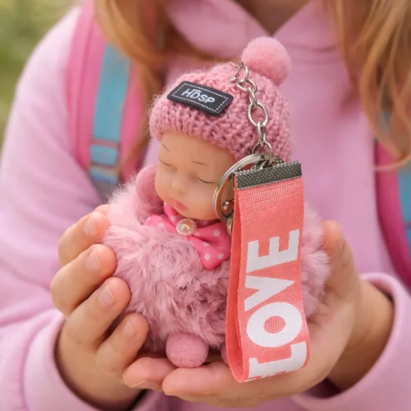 The doll features gentle pink tones, a cute knitted hat, and a secure metal keyring with a fabric strap, making it easy to attach to backpacks, school bags, pencil cases, or keys. Lightweight and soft to the touch, it’s ideal for kids to carry around without adding bulk.