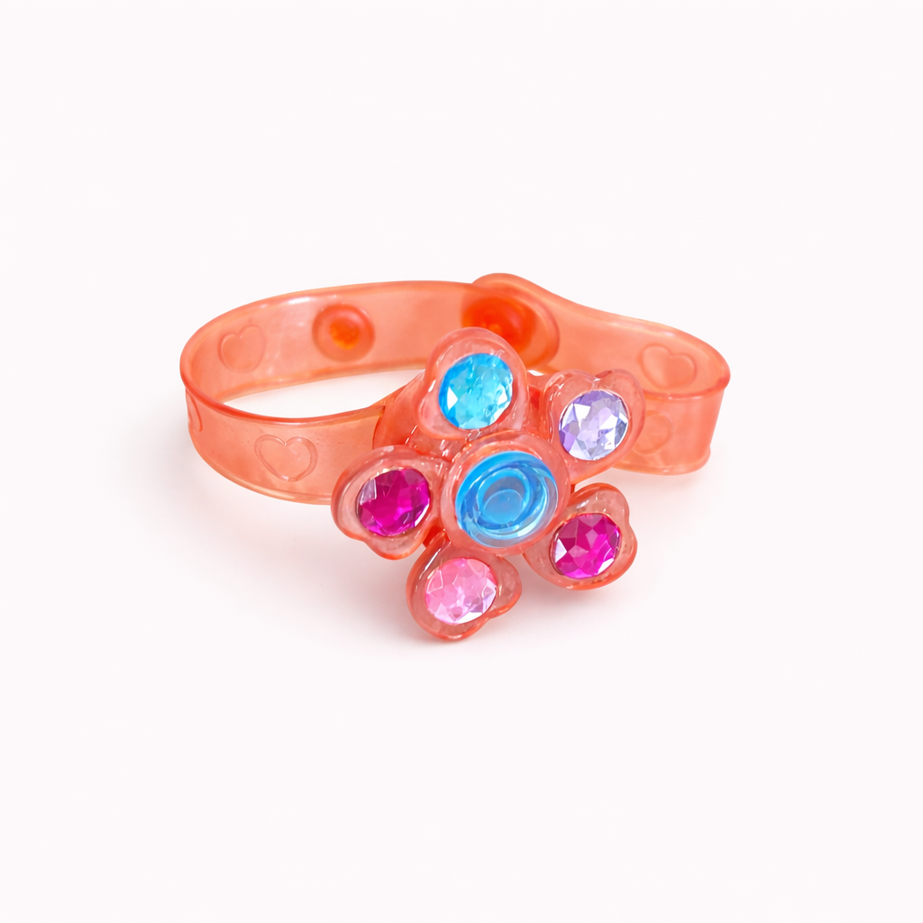 This charming bracelet is made from translucent pink material and features a sweet flower-shaped centerpiece. The flower is decorated with bright, faceted gem-style accents in blue, purple, and pink tones, creating a sparkling, eye-catching design. Subtle heart shapes are embossed along the bracelet band, adding an extra touch of whimsy and charm. Lightweight and comfortable to wear, this bracelet is perfect for children or anyone who loves colorful, playful accessories. Its cheerful design makes it ideal for everyday wear, dress-up play, or as a delightful gift.