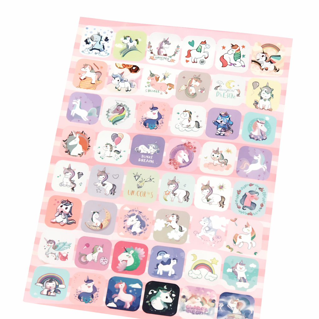 Bring imagination to life with this delightful unicorn sticker sheet designed especially for kids. Featuring a variety of cute and colorful unicorn characters, these stickers are perfect for decorating notebooks, diaries, greeting cards, craft projects, and more.