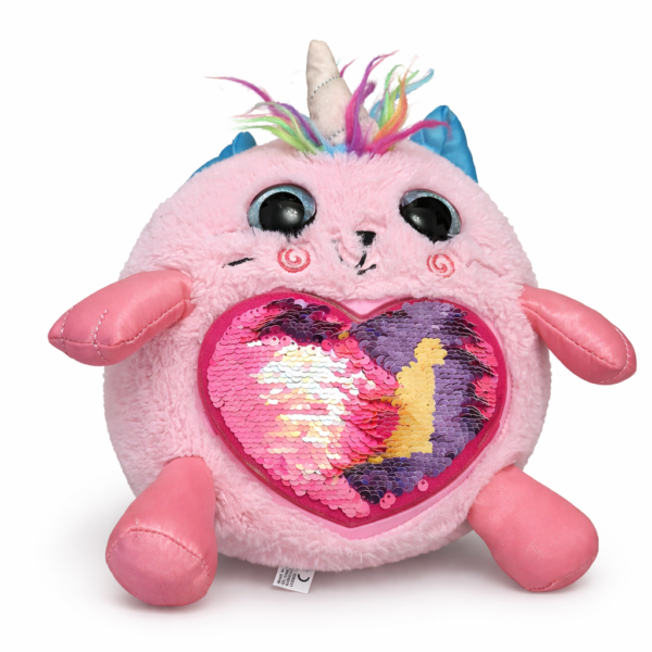 Adorable pink unicorn plush toy featuring a sparkling reversible sequin heart and soft, cuddly fabric. Perfect for hugs, playtime, and magical gifting.