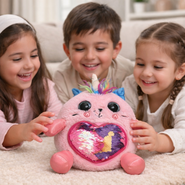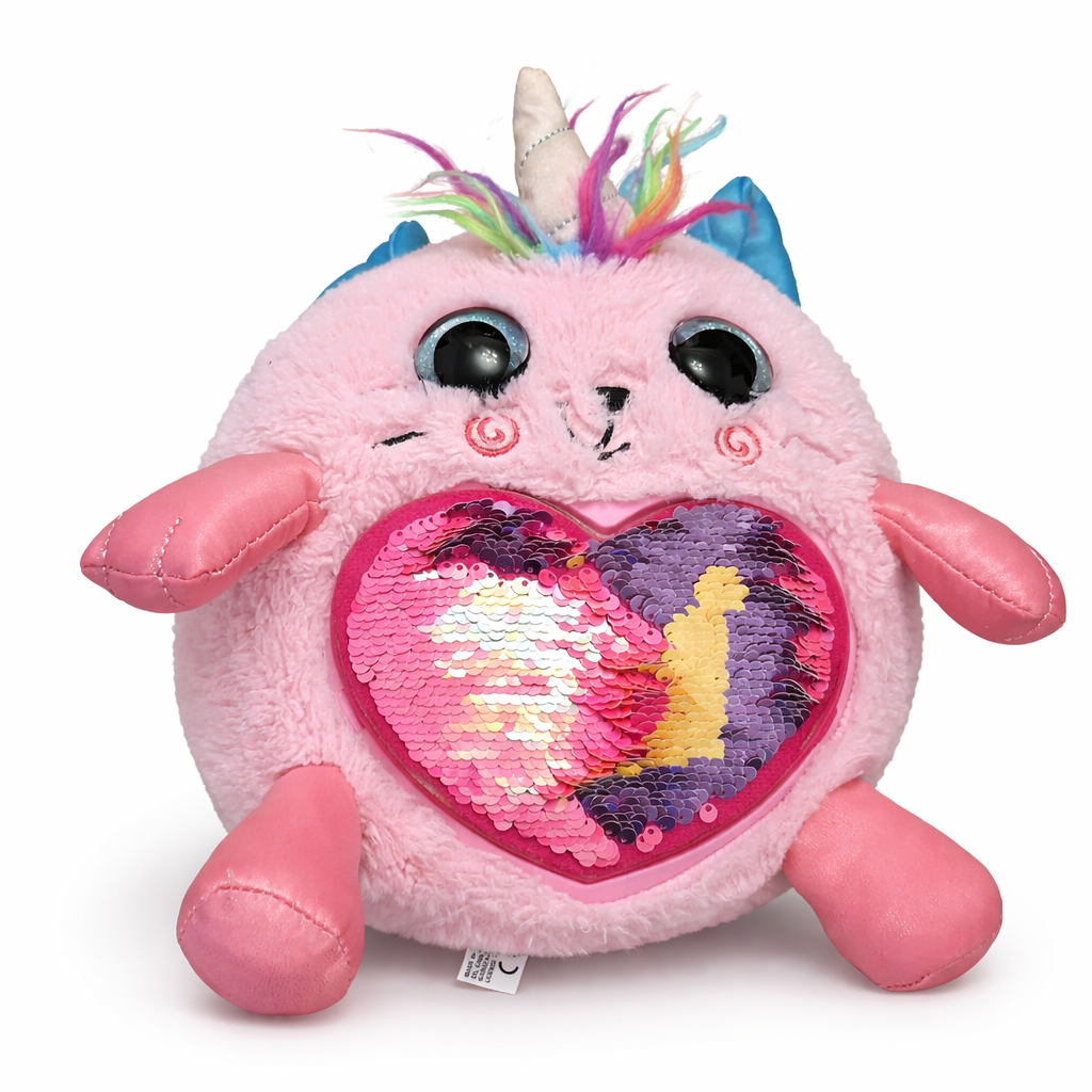 The standout feature is the beautiful heart-shaped sequin panel on the front. Simply swipe your hand across the sequins to reveal different colors and patterns, adding an interactive sensory element kids love. Its big glittery eyes, cute facial expression, and soft pastel tones make it irresistible for children and collectors alike.